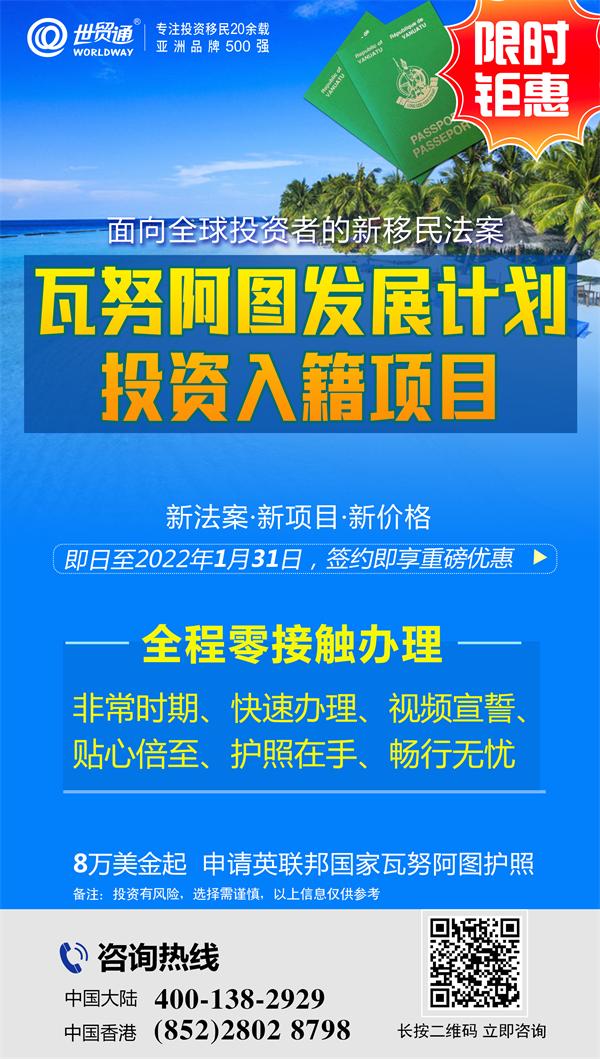 重大好消息!为感谢世贸通新老客户一直以来的关注和支持,即日至2022年1月31日,瓦努阿图发展计划投资入籍项目限时钜惠,签约即享重大优惠!目前,活动火爆进行中,惊喜多多!