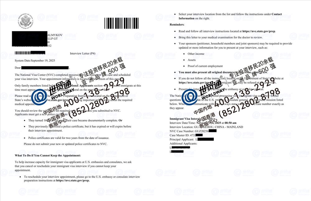 在世貿通迎來19周年慶典之際,喜訊不斷傳來:由世貿通獨家代理大中華區的「大學城希爾頓酒店」EB-5鄉村項目再度傳來重磅捷報——多位投資者已陸續收到2025年11月美國移民簽證面試通知,面試地點為廣領館!