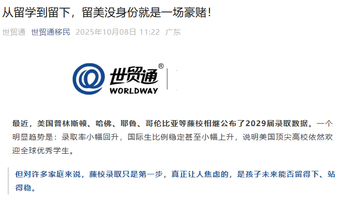 最近,美国普林斯顿、哈佛、耶鲁、哥伦比亚等藤校相继公布了2029届录取数据。一个明显趋势是:录取率小幅回升,国际生比例稳定甚至小幅上升,说明美国顶尖高校依然欢迎全球优秀学生。但对许多家庭来说,藤校录取只是第一步,真正让人焦虑的,是孩子未来能否留得下、站得稳…
