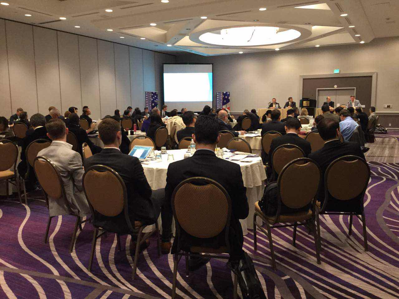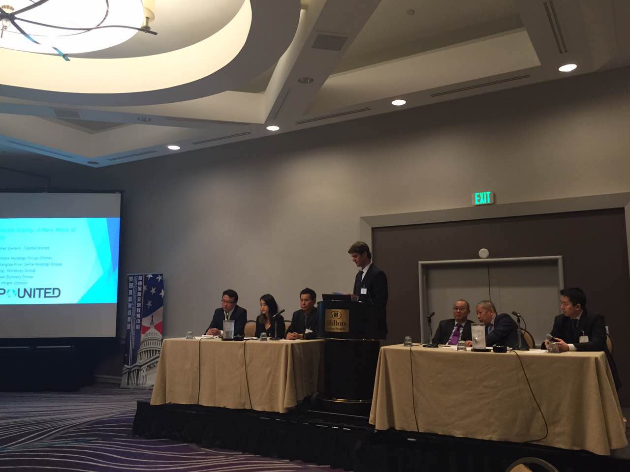 世貿通移民集團總裁Winner Xing 博士(左一)在中國私募論壇發表演講