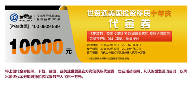 了解了這些,你是否也覺得不得不移民希臘了呢?別急,小編還有一個利好要告訴你,正值2016年世貿通美國投資移民10年慶,爲了回饋廣大投資者,世貿通送出千張萬元服務費代金券,投資者憑券辦理移民即可抵扣一萬元移民服務費。活動詳詢熱線:(852)2802 8798