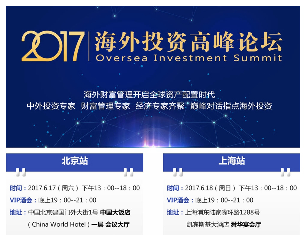由世贸通财富俱乐部、全联房地产商会联合主办,世贸通移民集团、世贸通北京公司、世贸通上海公司承办的“2017海外投资高峰论坛”将于6月17、18日分别在北京、上海举行,预约方式,请拨打尊贵免费预约热线:400-138-2929。