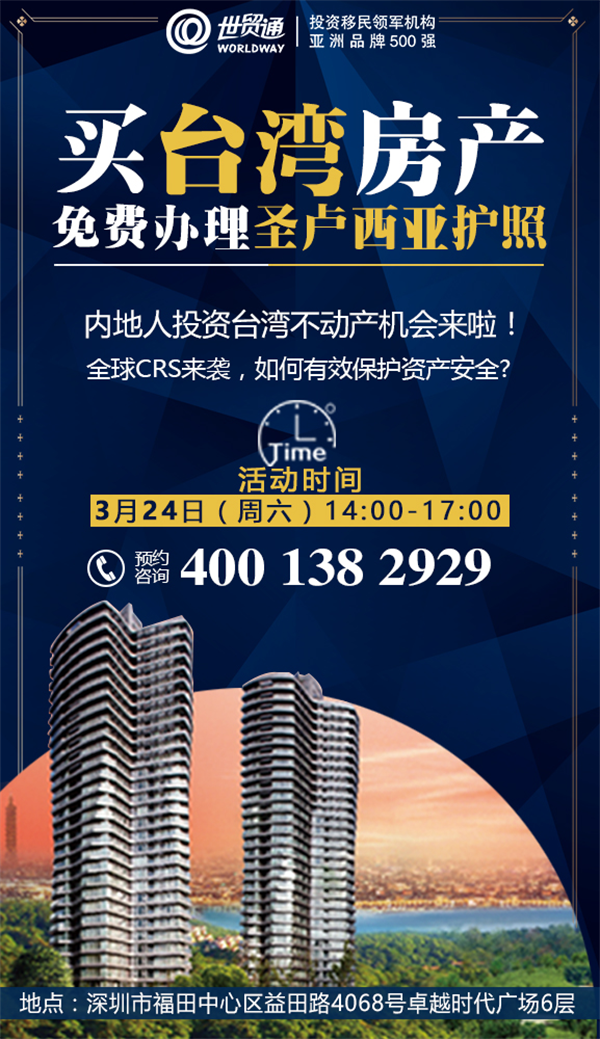 买台湾房产 免费办理圣卢西亚护照时间:2018年3月24日(周六)14:00-17:00预约咨询:400-138-2929地址:深圳市福田中心区益田路4068号卓越时代广场6层