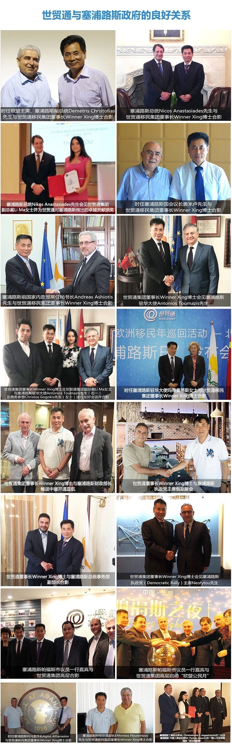 亚洲品牌500强和投资移民行业领军机构的世贸通集团,作为塞浦路斯投资移民的开拓者,在推广塞浦路斯护照移民方面始终走在行业前列:2011年,较早将塞浦路斯永久居留及特许入籍计划引入中国,开启欧洲投资移民精彩之旅;2014年,北京、上海的“帕福斯之夜”活动,是中国以欧洲城市为主题的投资及文化交流活动。