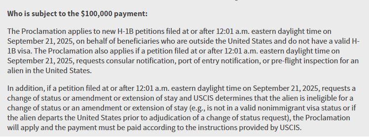 1. 申請人在美國境外且無有效H-1B簽證,僱主為其提交的新H-1B申請(在2025年9月21日凌晨或之後)。