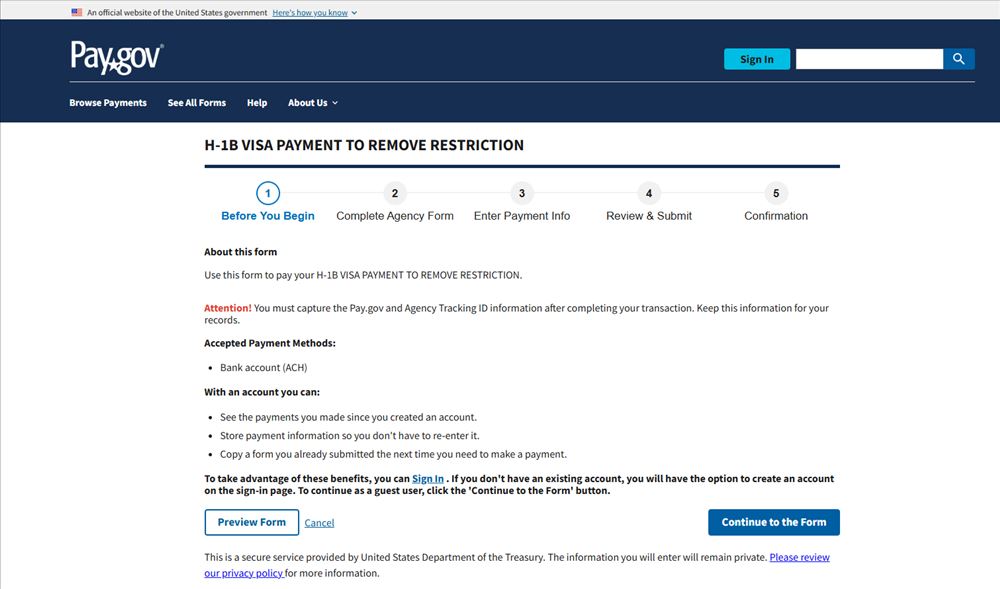 僱主需在提交H-1B申請前通過 Pay.gov(https://www.pay.gov/public/form/start/1772005176)支付10萬美元,並隨案提交支付憑證。若符合國土安全部部長的「國家利益豁免」條件,需附上豁免證明。未按要求提交憑證的申請將被拒絕。