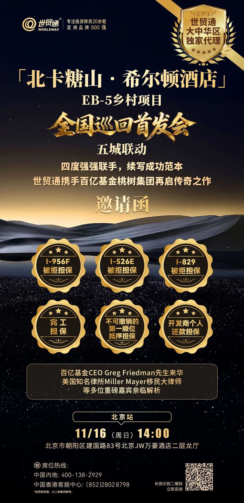 世貿通首頁 > 最新活動 > 北京站-北卡糖山·希爾頓酒店-EB-5鄉村項目-全國巡迴首發會