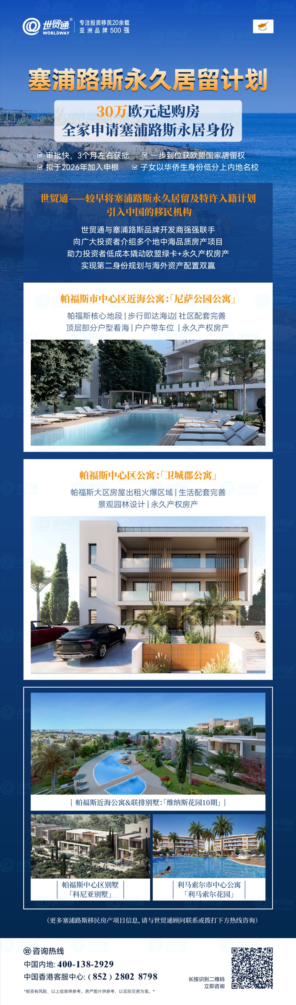 目前,30萬歐元起購房,全家申請塞浦路斯永居身份,並且滿足相關條件之後,還可申請塞浦路斯歐盟護照。政策紅利窗口期有限,世貿通建議廣大有意向的投資人把握機會,儘早行動。