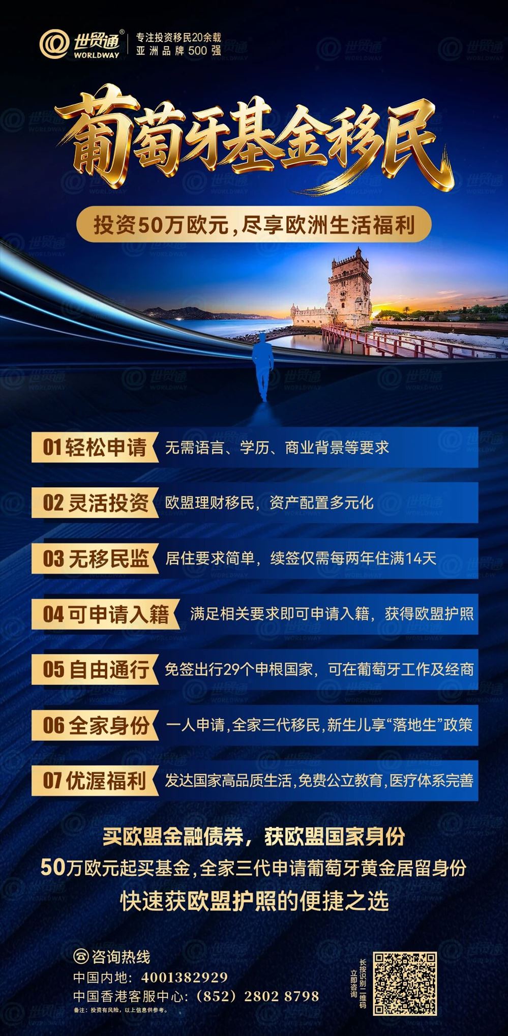 目前,通過葡萄牙基金投資移民項目,投資者投資50萬歐元起買基金,即可全家三代申請葡萄牙黃金居留身份。
