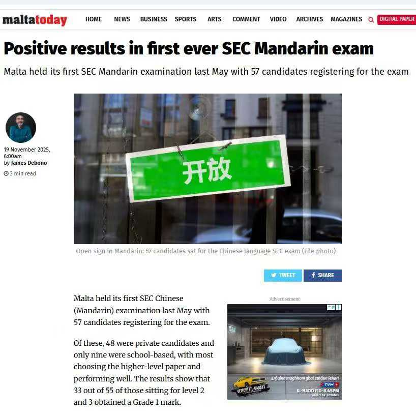 2025年,馬耳他全國中考(SEC)首次將中文(普通話)納入正式科目,與馬耳他語(作爲外語)、戲劇、舞蹈和核心科學一起成爲新增科目,標誌着這個地中海小國在中學教育層麵向多元化、國際化邁出了關鍵一步。