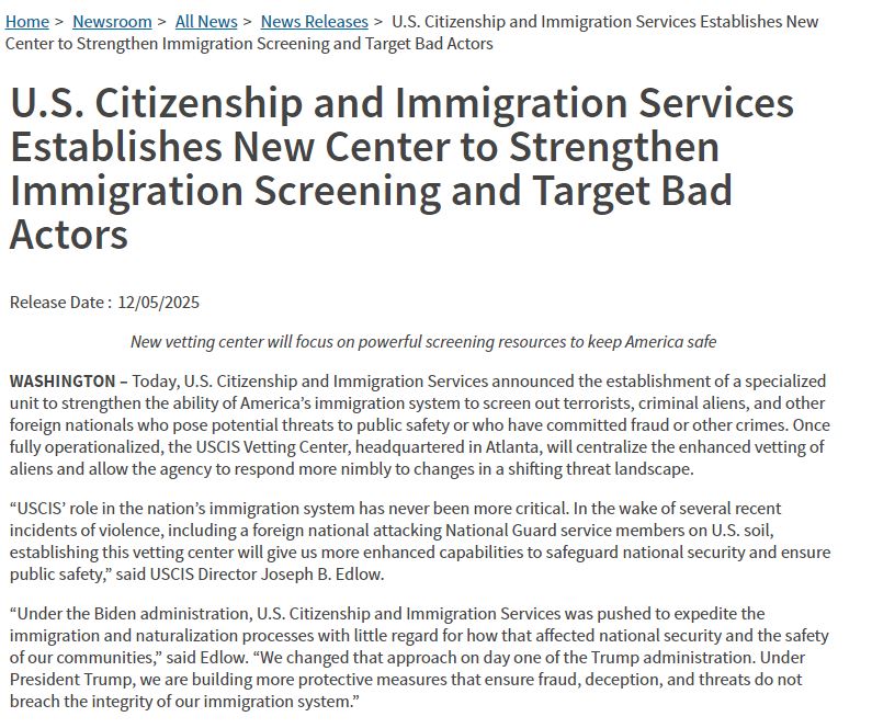 美國移民局(USCIS)局長在宣佈新的審查中心成立時特別強調:「我們的目標並不是阻止合法移民,而是確保每一個進入美國的人都經得起安全審查。」