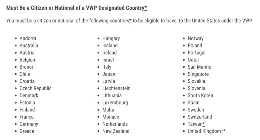 美國的VWP 免簽計劃(Visa Waiver Program)目前共有42個國家,包括英國、法國、澳大利亞、日本等。這些國家公民以旅遊、探親、短期商務為目的赴美,無需申請簽證,只需: