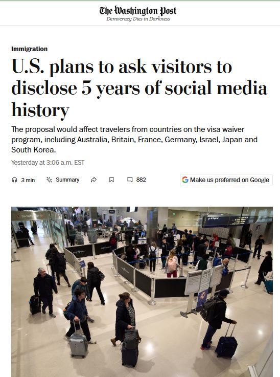 近日,美國海關與邊境保護局(CBP)在《聯邦公報》上發佈擬議變更:計劃要求免簽外國遊客在入境美國前披露過去五年的社交媒體歷史記錄。