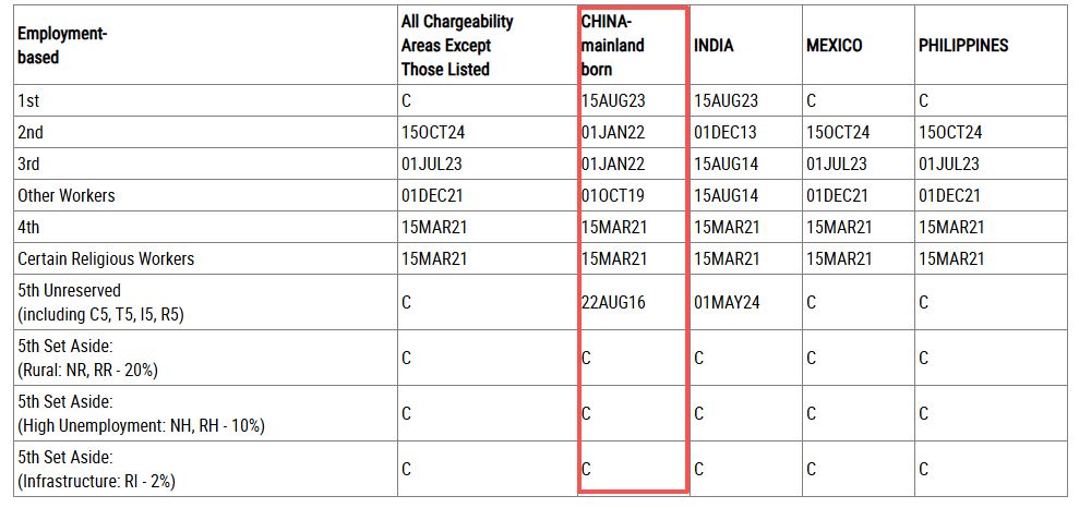 B表:Dates For Filing Of Employment-Based Visa Applications