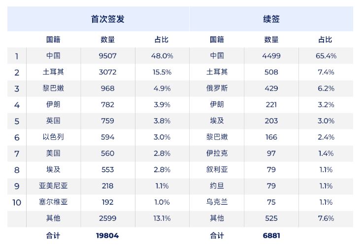 按國籍劃分的黃金簽證數量(主申請人)