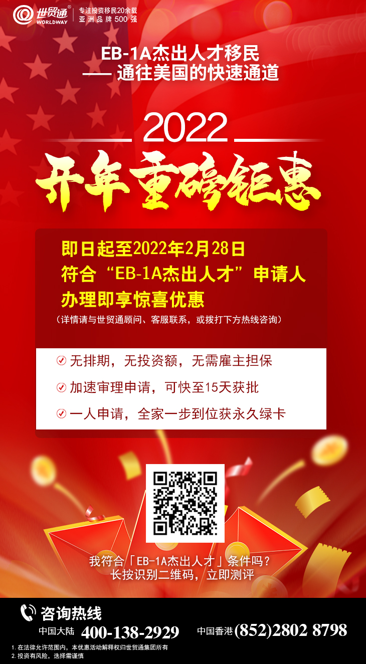2022年快速移民美国的热门选择——EB-1A杰出人才移民,即日起至2022年2月28日,符合“EB-1A杰出人才”申请人,办理即享惊喜优惠!优惠名额有限,先到先得!
