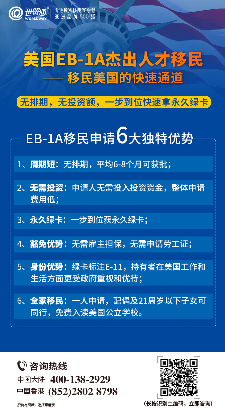 EB-1A移民申请即杰出人才移民申请,隶属美国职业移民第一优先类别,是美国为招揽世界上优秀人才,特别是针对在科学、艺术、教育、商业及体育等领域有杰出能力的人士,而设立的移民捷径之一。EB-1A签证无需排期,无需投资,审理周期短,一步到位获发永久绿卡,备受投资者欢迎。