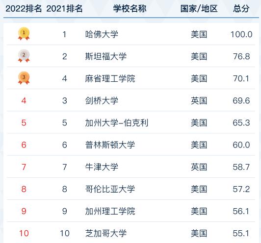 排名中,哈佛大学仍然稳坐头把交椅,连续20年蝉联全球第一,斯坦福大学仅次于哈佛大学,继续保持全球第二名,麻省理工学院位列全球第三。其他进入前10的美国大学分别为:加州大学-伯克利(第5名),普林斯顿大学(第6名),哥伦比亚大学(第8名),加州理工学院(第9名),芝加哥大学(第10名)。