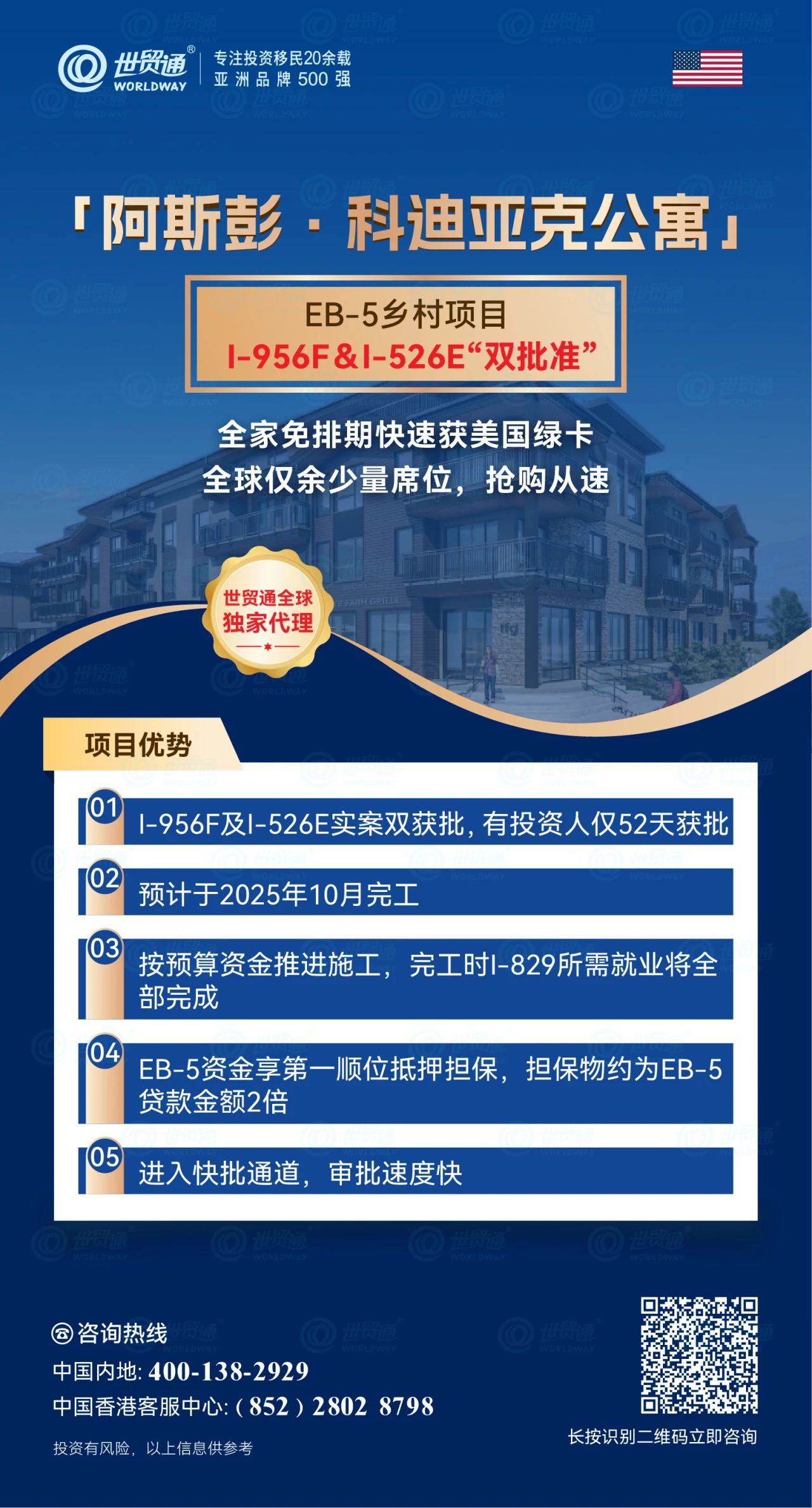 在此,世贸通集团特此温馨提醒已经签约的投资人,务必高度重视打款事宜。请在签署合同后尽快完成打款流程,确保您的投资名额得到有效锁定,这将有助于您快速获取美国绿卡,顺利开启移民之旅。由世贸通担任全球独家代理的「阿斯彭▪科迪亚克公寓」EB-5乡村项目,全球仅余少量席位,抢购从速!
