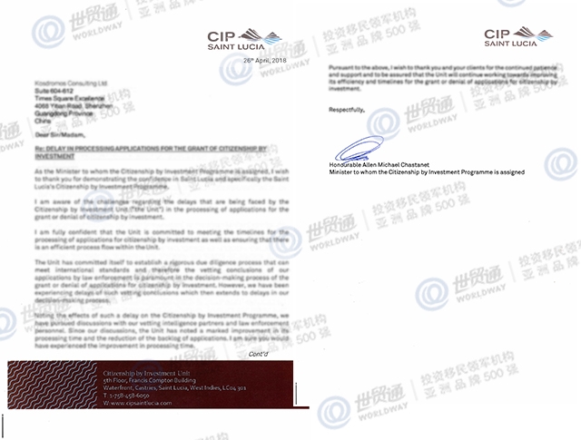事实上,近期,世贸通就有一批客户在短短3个月零8天的时间内获批圣卢西亚护照,正如Allen Michael Chastanet总理信中所言,世贸通客户已体验到了圣卢西亚移民局审批速度进一步加快的益处。