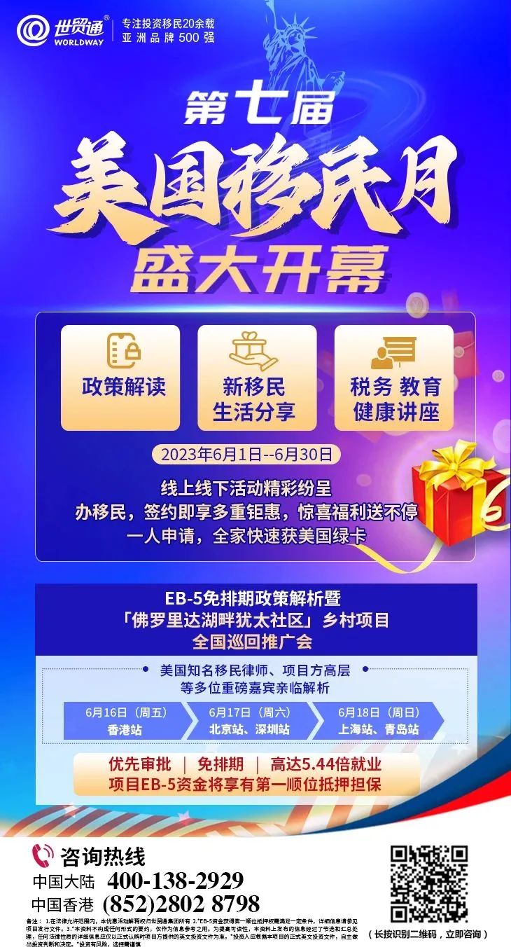 在第七届美国移民月期间,世贸通正陆续开展一些列线上线下活动,涵盖政策解读,新移民生活分享,税务、教育、健康讲座等众多主题,助力投资人抢抓2023年免排期移民美国的黄金机会。此次,为庆贺第七届美国移民月活动,世贸通特推出重磅优惠,办移民,签约即享多重钜惠,惊喜福利送不停!机会千载难逢,优惠名额有限,早行动早受益。