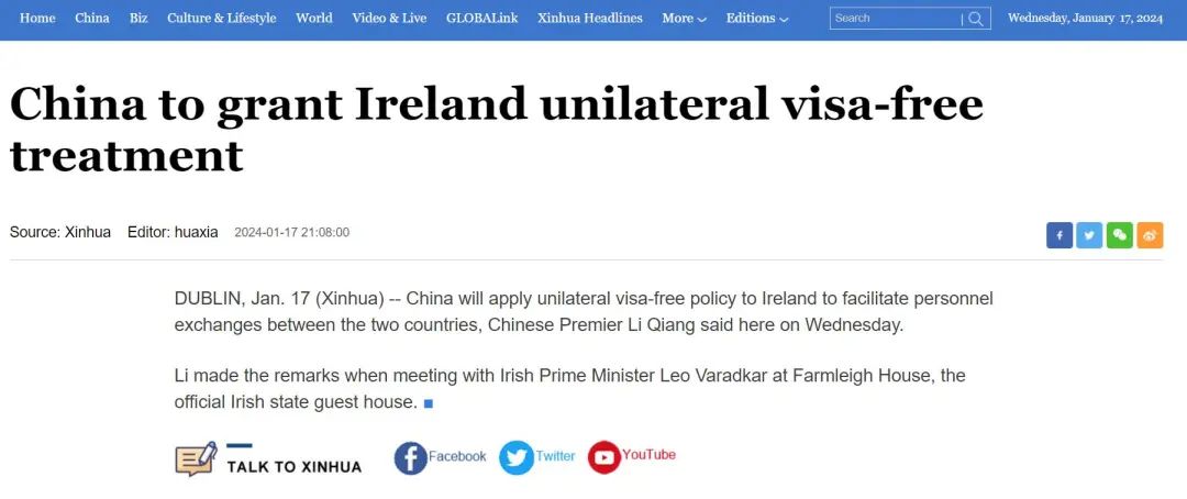 好消息!好消息!继中国宣布将给予瑞士单方面免签待遇后,近日,中国又宣布将对爱尔兰实行单方面免签待遇,便利两国人员往来。