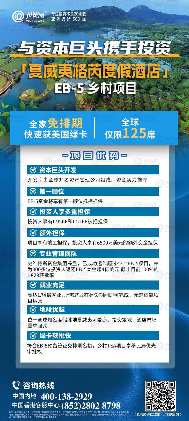 该项目是EB-5投资移民项目中少有的,由资本巨头强强联手开发的项目,开发商实力超群,资金实力雄厚。项目是符合新法案下乡村TEA项目,集优先审批、免排期、EB-5资金将享有第一顺位抵押担保、EB-5投资人享有I-956F和I-526E被拒担保等多重担保、投资人享有6500万美元额外资金担保、经验丰富的知名项目方操盘等独特优势,此项目拥有众多优势,快速获美国绿卡机会,可遇不可求。