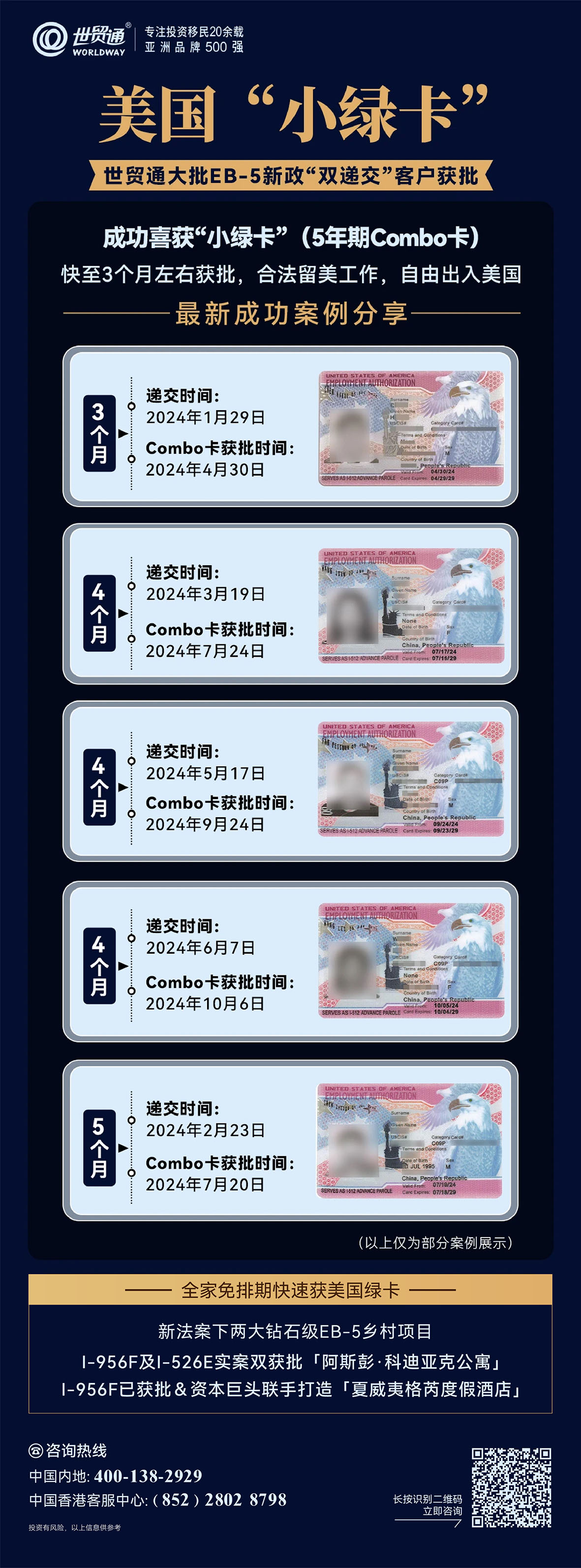可以说,EB-5新法案中的“双递交”是EB-5新法最为利好的改革之一!EB-5新政下,世贸通已经有众多“双递交”客户,获得Combo卡,最短仅用时3个月,这使得他们能够在美国自由地工作和出行,充分体现了新政策为投资者生活和工作带来的便利。