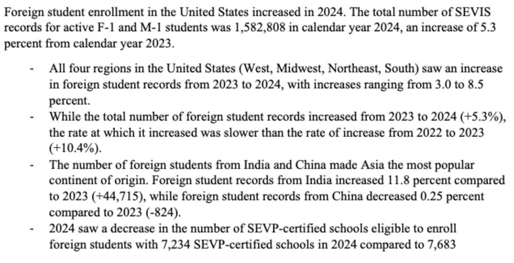 SEVIS:2024年在读总人数1582808,同比增长5.3%,但中国籍在读人数微降0.25%,印度籍则大幅增长 11.8%。