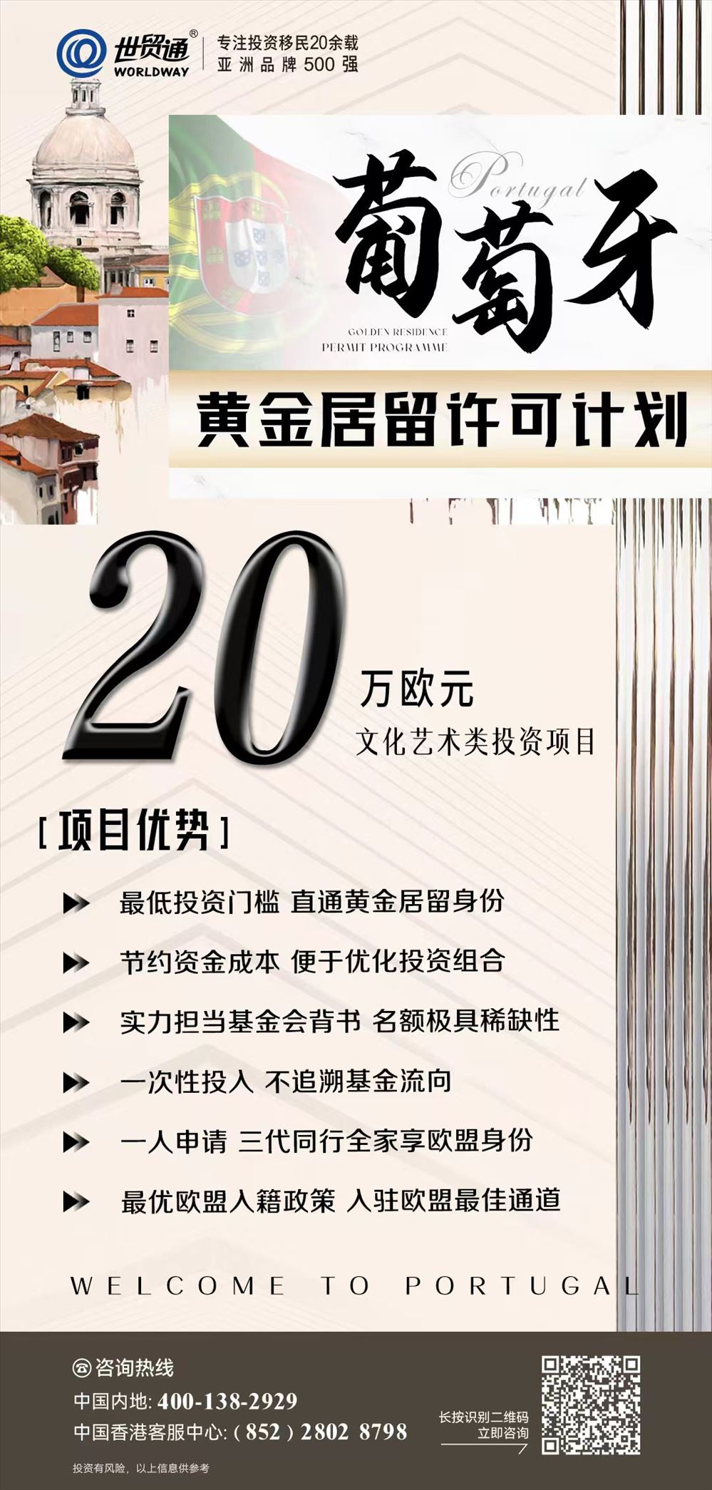 另外,也可通过葡萄牙文化艺术捐赠项目移民葡萄牙。根据法案规定,申请人仅需投资20万欧元,即可全家三代申请葡萄牙黄金居留身份,低成本便捷获欧盟护照。