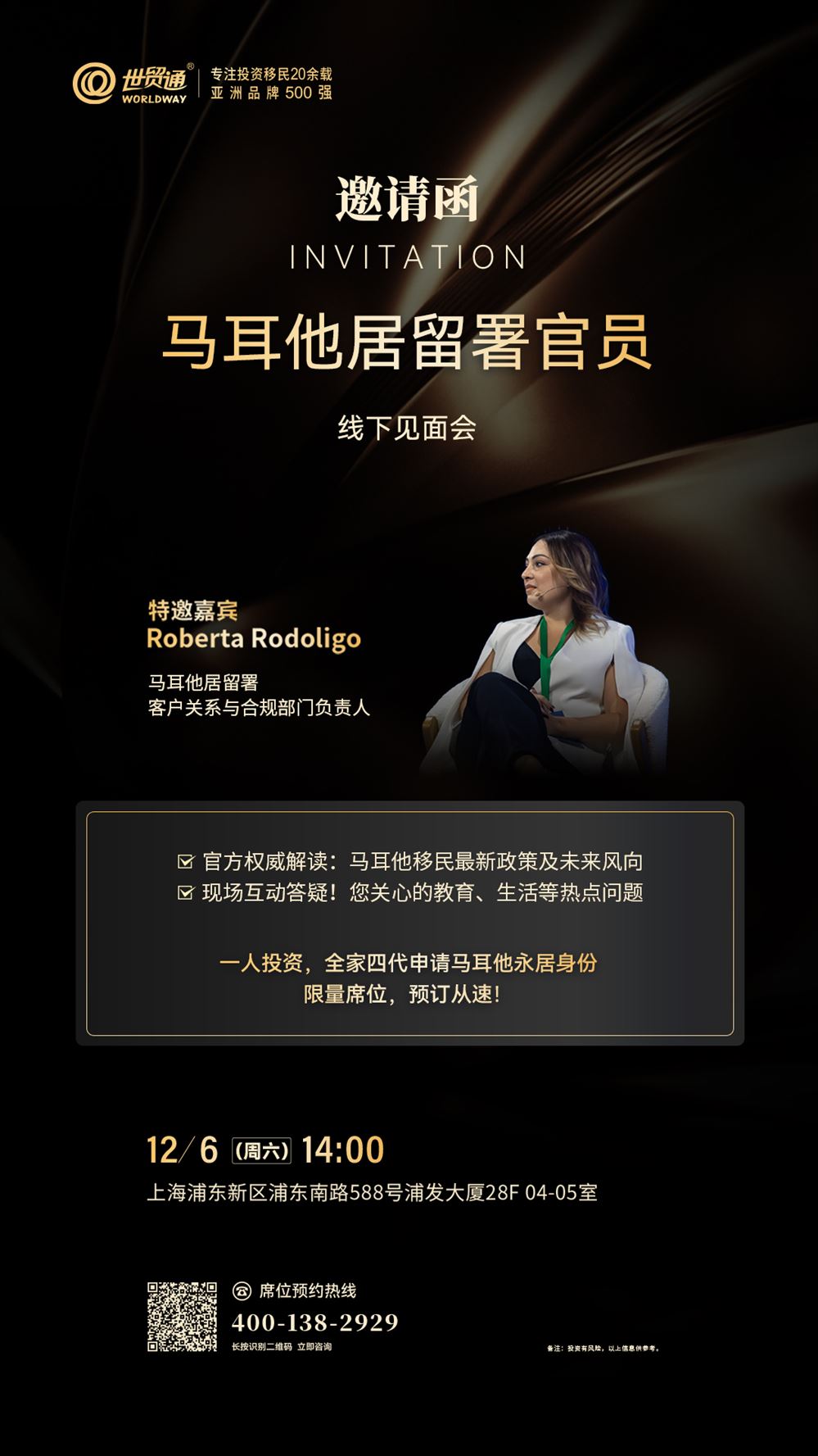 本次见面会特邀马耳他居留署客户关系与合规部门负责人Roberta Rodoligo女士亲临现场。作为马耳他居留署官员,Roberta Rodoligo女士将从官方视角进一步披露永居身份政策细节,剖析政策背后的移民机遇,让您对马耳他移民申请的条件、流程、优势一目了然,精准把握申请窗口期。