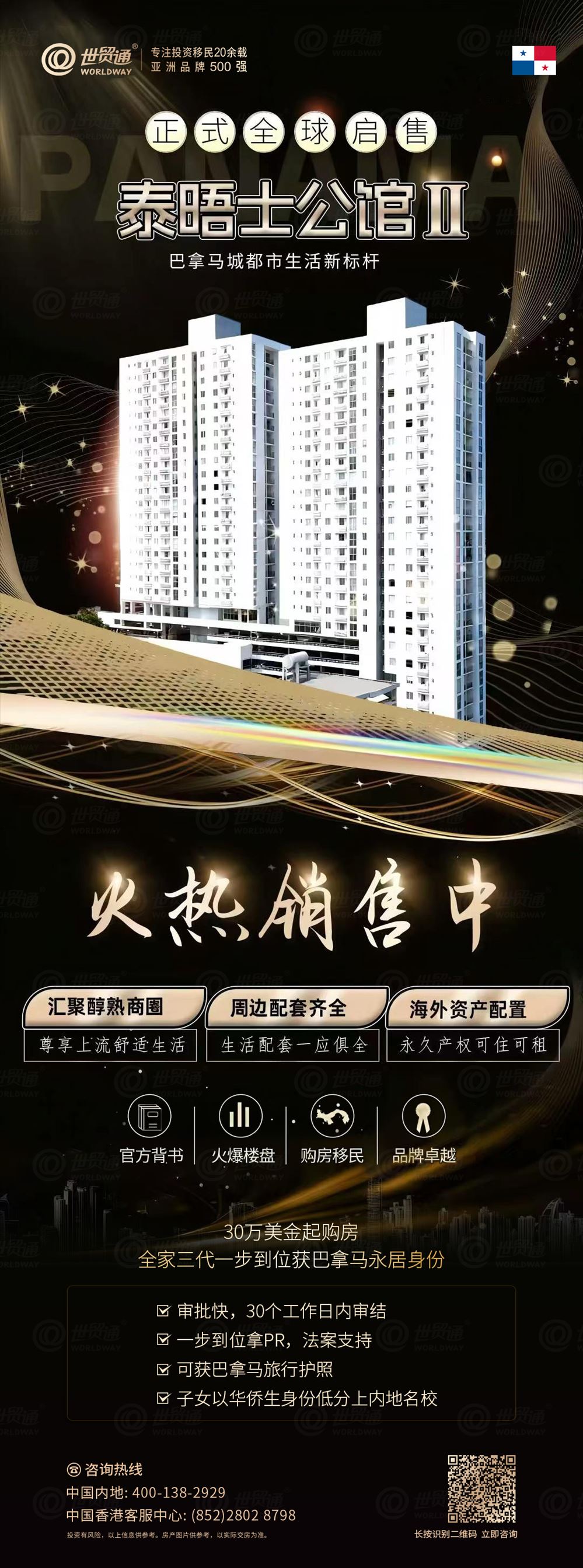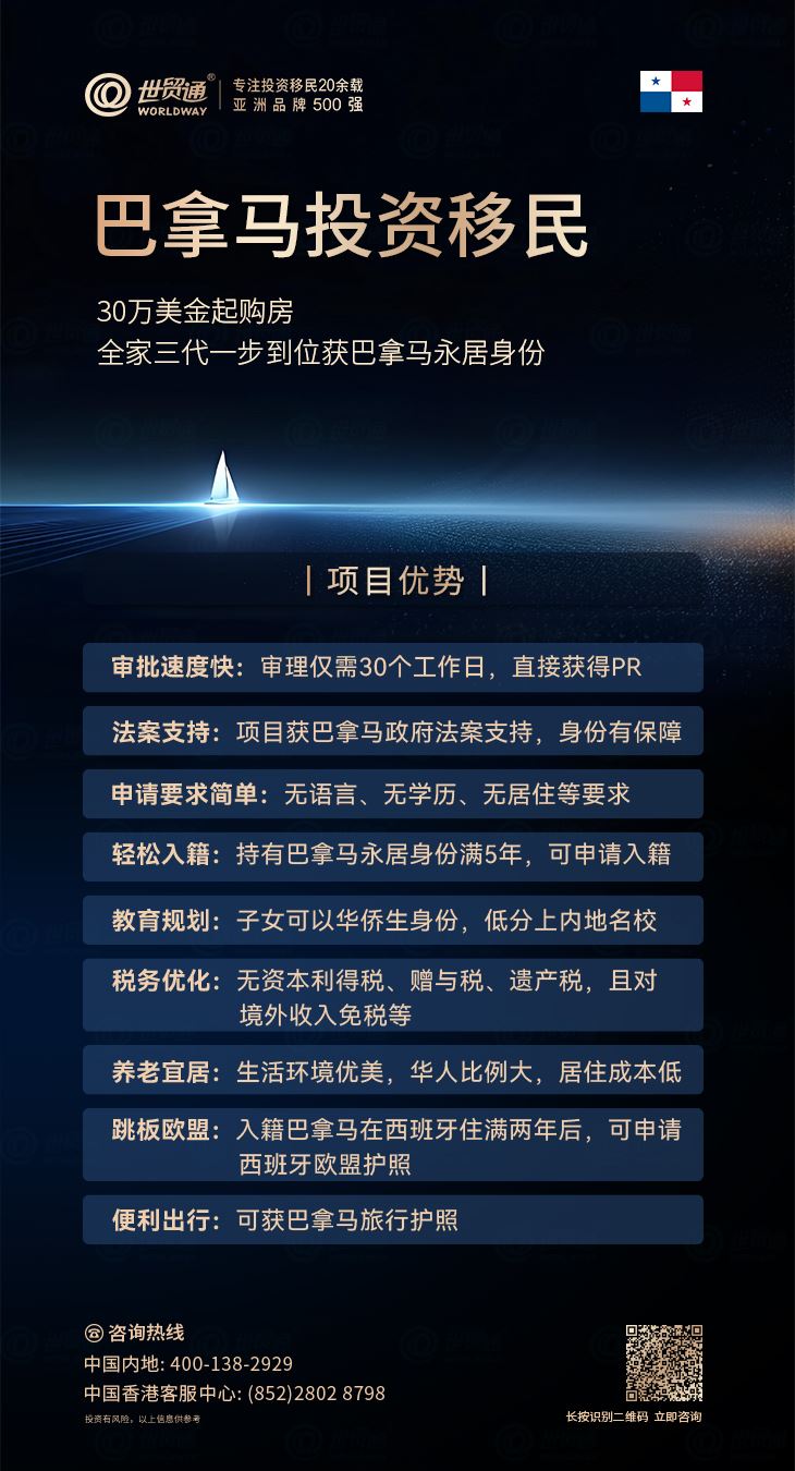 世贸通集团,亚洲品牌500强,专注投资移民20余载,是您办理巴拿马移民的放心之选。建议有意向的家庭立即行动,尽早启动申请。世贸通与巴拿马品牌开发商强强联手,隆重向广大投资者精选巴拿马城高品质房产项目,助力投资者实现海外身份规划与海外资产配置的双赢。