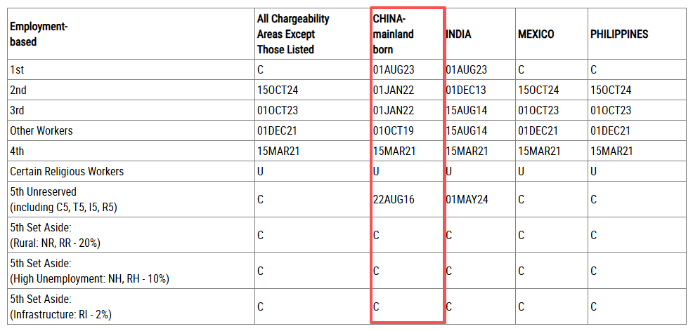 A表:Final Action Dates For Employment-Based Preference Cases