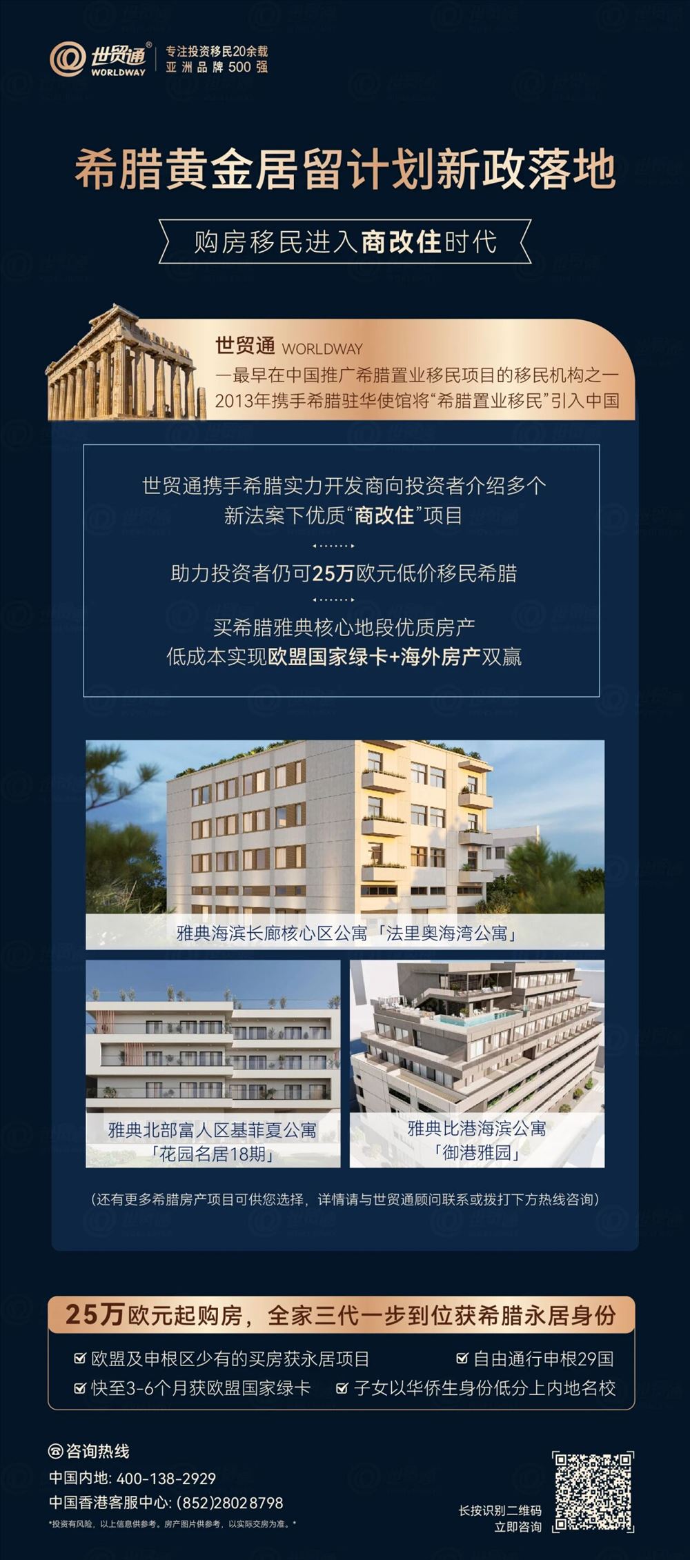 不必纠结“是否会延期”,不必观望“政策是否会反转”,移民从来都是“先到先得”,尤其是在政策窗口期的最后阶段,每犹豫一天,就可能多一分遗憾。如果您对希腊黄金签证项目感兴趣,请及时联系世贸通顾问或客服咨询!我们将为您提供专业的服务,助您圆梦欧洲!