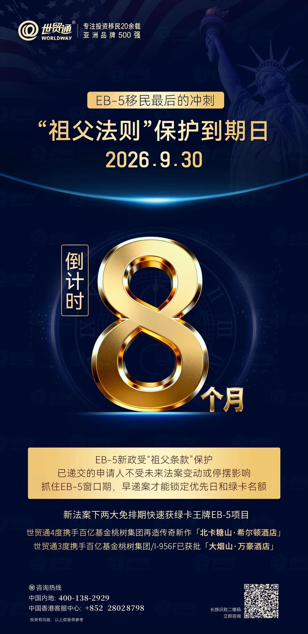 窗口期明确、时间有限。目前,世贸通手握两大高品质EB-5乡村项目,助力投资者稳妥、无排期、高效地实现美国身份规划,快速踏上美国新生活之路。全球名额有限,席位稀缺,先到先得!