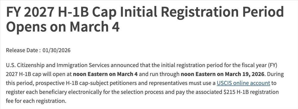 近日,美国移民局(USCIS)正式公布:2026财年H-1B抽签类签证的网上电子注册窗口将于——美国东部时间3月4日中午12:00开放,3月19日中午12:00截止。