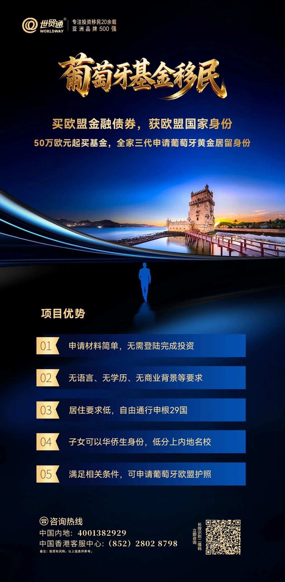 目前,您可通过葡萄牙基金投资移民项目,投资50万欧元起买基金,即可全家三代申请葡萄牙黄金居留身份,满足相关条件,可申请葡萄牙欧盟护照。