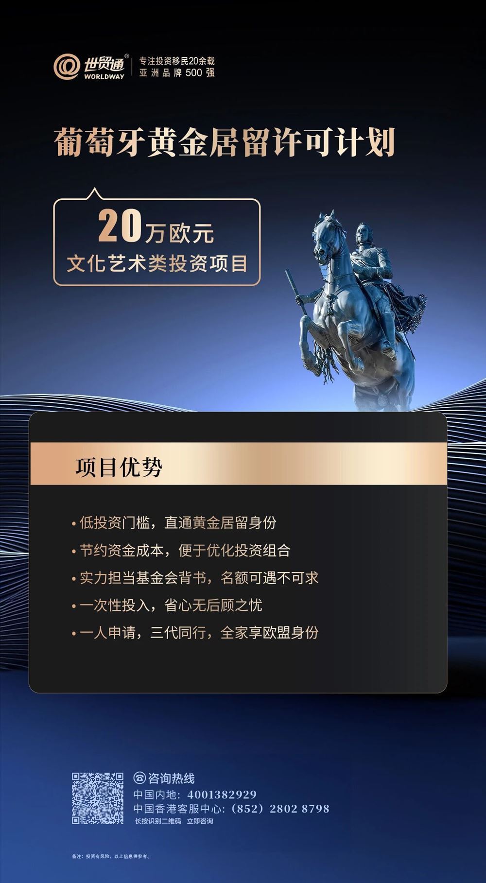 另外,也可通过葡萄牙文化艺术捐赠项目移民葡萄牙。根据法案规定,申请人仅需投资20万欧元,即可全家三代申请葡萄牙黄金居留身份,低成本便捷获欧盟护照。