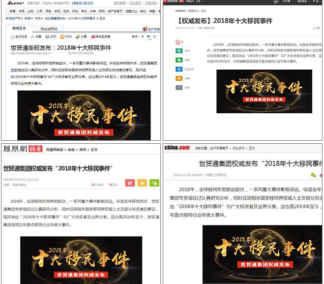 2017.05.15一文激起千层浪!近日,“2018年十大移民事件”一经世贸通集团发出,便引发行业及国内众多媒体的高度关注,短时间内被全国多家媒体进行转载报道,包括新浪网、凤凰网、网易、中国新闻网等主流媒体迅速传播,成为业内外瞩目的焦点。