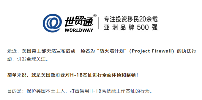 最近,美国劳工部突然宣布启动一项名为 “防火墙计划”(Project Firewall)的执法行动,引发全球关注。简单来说,就是美国政府要对H-1B签证进行全面体检和整顿!目的是:保护美国本土工人,打击滥用H-1B高技能工作签证的行为。